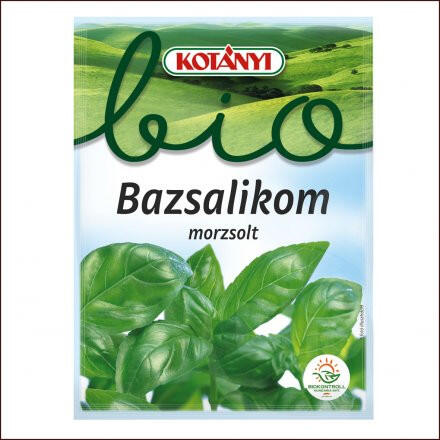 "A KOTÁNYI Bio fűszerek válogatott mezőgazdasági régiókból és ellenőrzés alatt álló ökológiai gazdálkodásokból származnak. Így tökéletesen kifejezésre jutnak a fűszerek eredeti illat- és ízharmóniái és garantálják a természet igazi ízét. Az államilag is elismert ""Austria Bio Garantie"" és Biokontroll Hungária Kht. tanúsítványai (HU-ÖKO-01) garantálják a folyamatosan ellenőrzött ökológiai minőséget. A bazsalikom fő termesztési területe a Földközi-tenger vidéke és Észak-Afrika. A bazsalikom íze különösen jól harmonizál a paradicsommal és az olasz konyha különböző ételeivel. A termék gluténtartalmú gabonaféléket, tojást, tejet (laktóz), zellert, szóját, mustárt és szezámmagot is felhasználó gyártóüzemben készült. Száraz helyen tartandó. Tápértéktartalom 100g-ban: Energia 1262 kJ/301 kcal Zsír 4 g ebből telített zsírsavak 0,7 g Szénhidrát 43 g Ebből cukor 43 g Fehérje 14 g Só 0 g "