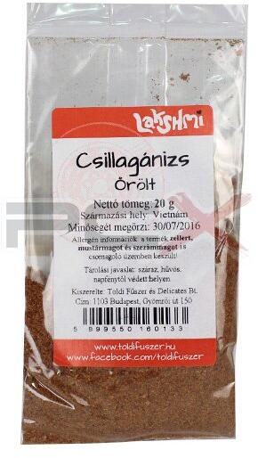 Egy trópusi örökzöld fa gyümölcse adja a fűszert.  , A gyümölcs nyolcágú és csillag alakzatot alkot, melyek mindegyik részében egy-egy rozsdabarna mag található. Illata és íze megegyezik az ánizséval, de a csillagánizs aromája kicsit intenzívebb. A Távol-Keleti konyhák egyik alapvető fűszere, valamint sokféle fűszerkeverék alkotóeleme.  Összetevők: , Őrölt csillagánizsAllergének:, A termék zellert, mustármagot és szezámmagot is csomagoló üzemben készült!Felhasználási javaslat:, Húsételek, gyümölcsleves, vagy édes krémek készítéséhez is kiváló.  Kiszerelés: 20g/dbSzármazási hely: KínaForrás: Gyártó/forgalmazó